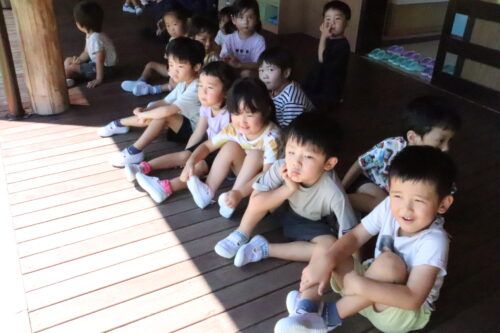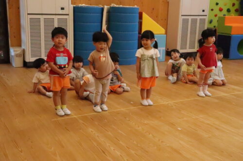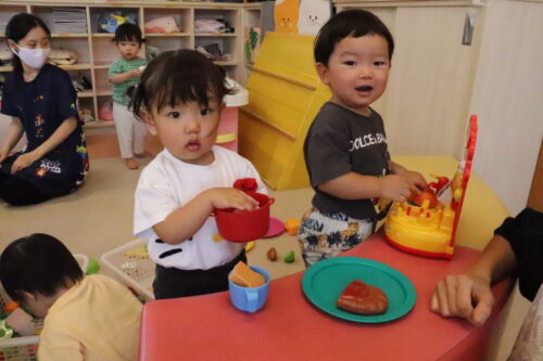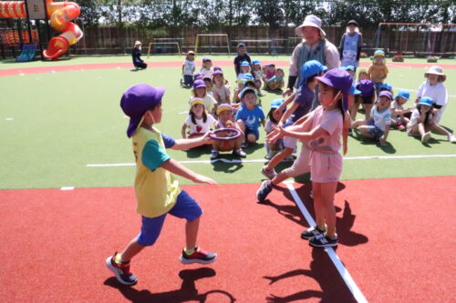 2025年9月16日 今日の子どもたち♪ みんなでよーいドン!最後まで諦めずに走りました。テラスからいろんなクラスが応援していました。みんな頑張っ~て!ひよこ組さんはおままごと。たくさんお料理できたね♪うさぎ組さんはホールでかけっこ。お返事とっても上手にできました☆