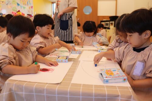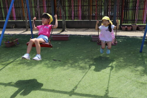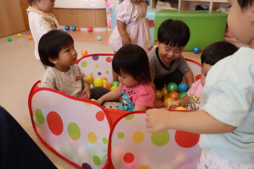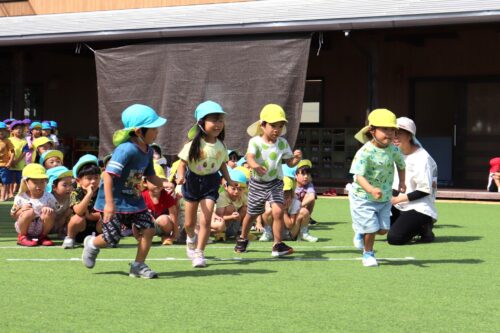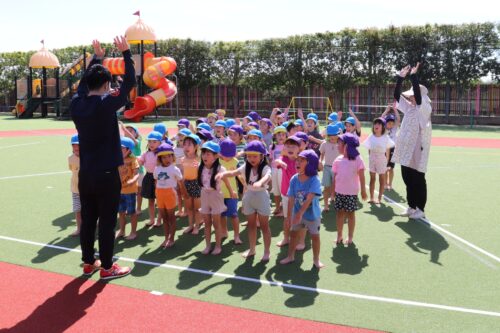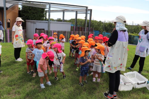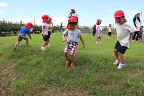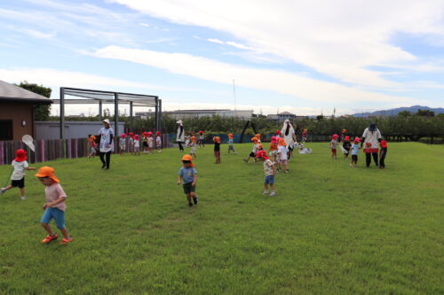 2025年9月22日 今日の子どもたち♪ 年少組さんが雑草園に出かけました。坂の所も上手に下りていきます。沢山のバッタを見つけて大興奮の子どもたちでした♪涼しくなって来たのでお外でも沢山あそびました。うさぎ組さんはお絵描き。とっても上手に描けました。ひよこ組さんは室内あそび。ボールプール楽しいね。今日は体育あそびの日。かけっこ頑張っています。最後はみんなでバンザーイ!