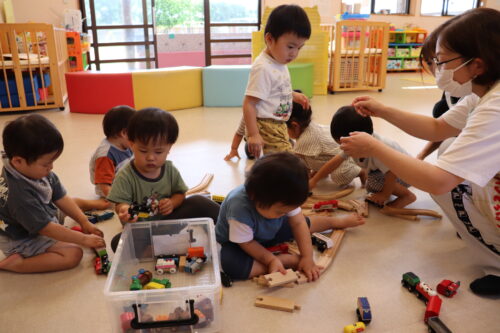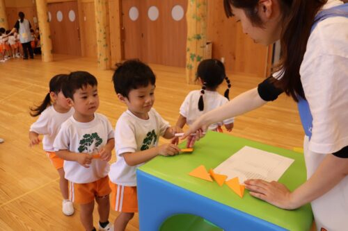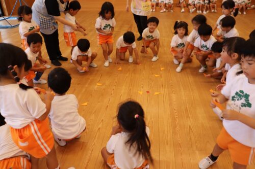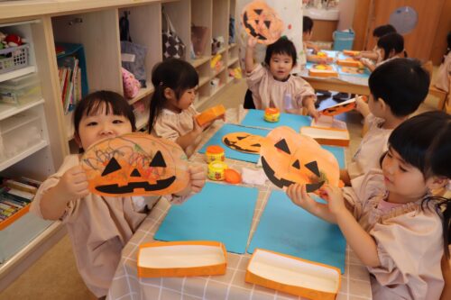 2025年10月2日 今日の子どもたち♪ 今日は運動会の応援席のくじ引きをしました♪音楽が止まったらくじを取ります。名前を書いて持ち帰ります♪どこだったかな?かわいいおばけカボチャができたよ♡レールをつなげるよ!