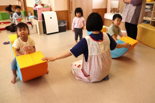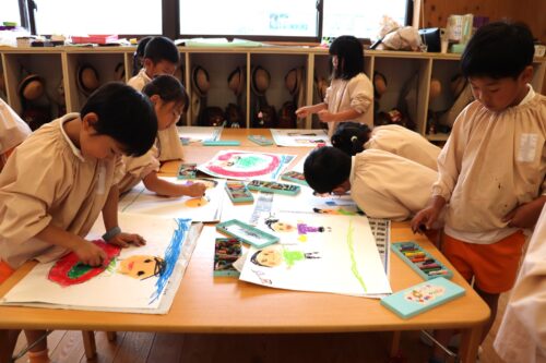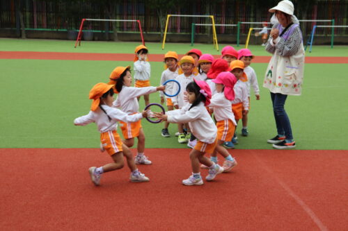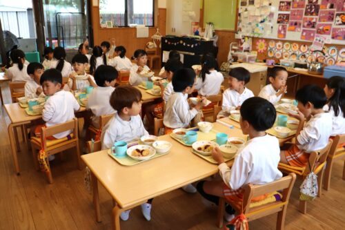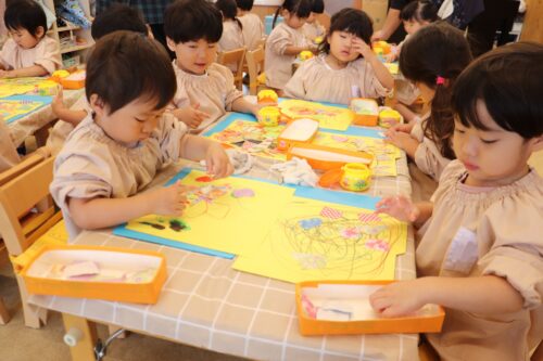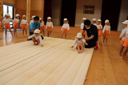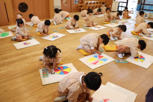 2025年10月21日 今日の子どもたち♪ 今日は体育遊びです。くまさん歩き!前転などマット運動をしたよ。運動会の思い出の絵を描きました。どの競技も楽しかったね♪運動会の年長さんの姿を見て、リレーしたい!と元気に走る年少さんです♪今週は給食を通じてSDGsを考える1週間です。今日は海がテーマです♪のりを使ってペタペタ貼るよ♪ゆらゆら気持ち良いね!