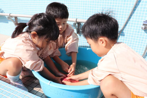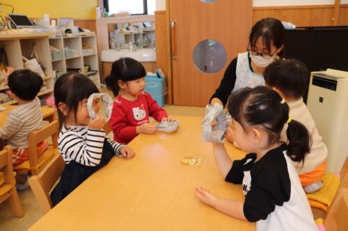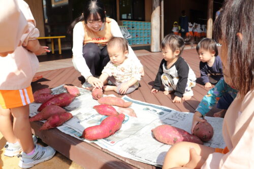 2025年10月27日 今日の子どもたち♪ もうすぐ焼き芋大会♪さつまいもを洗うよ!土落ちたかな??きれいになったよ。ひよこ組さんも興味深々♪焼き芋じゃんけん!じゃんけんぽん!新聞紙でまあるい輪っかができたね♡どんな音がするかな?色々な楽器に触れました♪今日は体育あそびがありました。年長さん足がぴーんと伸びてかっこいい!