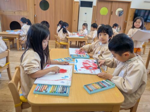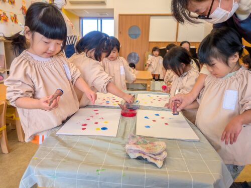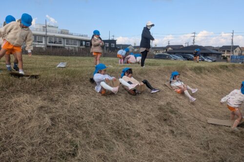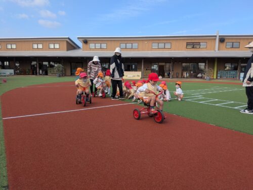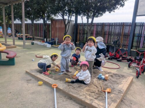 2025年11月21日 今日の子どもたち♪ 三輪車レース!がんばれー!昨日見学した消防車かっこよかったね。雑草園で芝滑り。楽しい~!お芋スタンプをしたよ。ハートの形かわいいね♡砂遊び大好きなひよこ組さんです♪