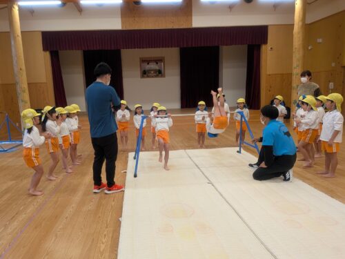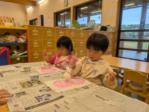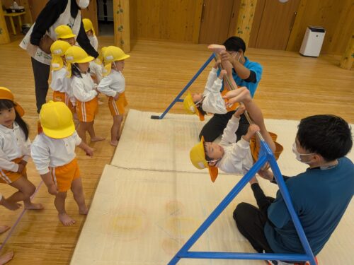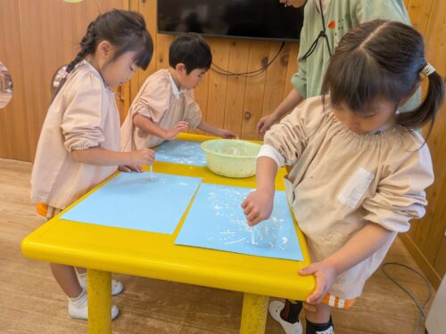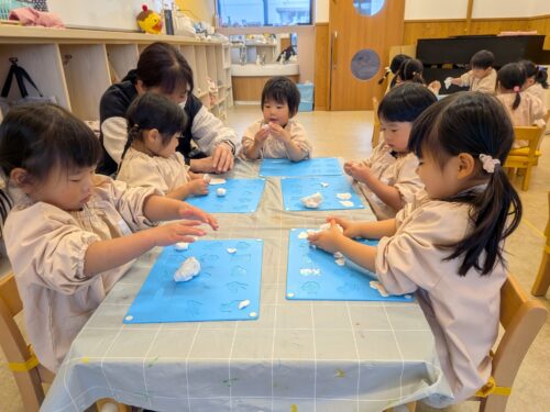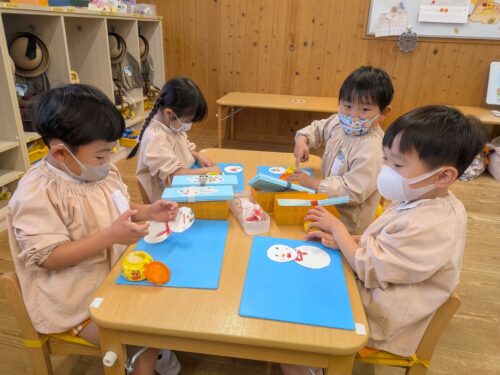 2025年11月25日 今日の子どもたち♪ 今日は体育あそびがありました♪足を伸ばして回るよ。年長さんは連続逆上がり。何回できるか勝負しました。かわいい雪だるまだね!こちらはストローで雪模様♪ポンポンで色付けしたよ。何を作ろうかな~?