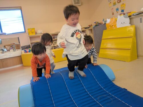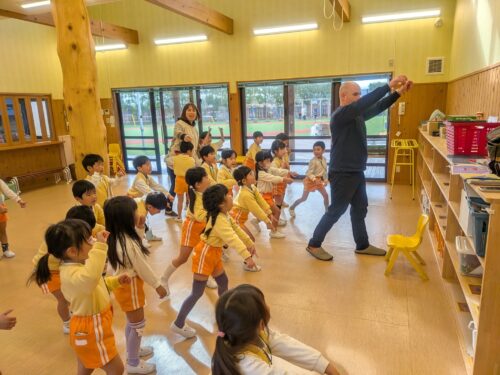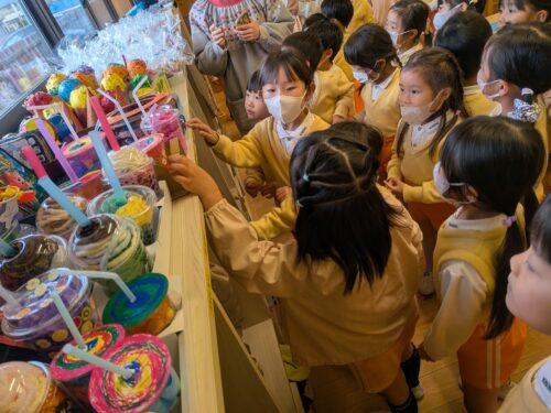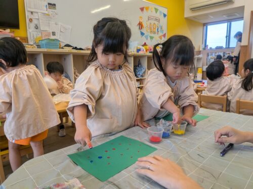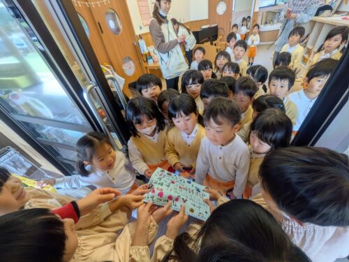 2025年12月3日 今日の子どもたち♪ もうすぐお店屋さんごっこ♪自分たちで招待状を書いて・・・各クラスにお届け。お買い物にきてね!商品の下見に訪れた年中さんに、おススメを伝えていました♡英語の音楽でDancing♪♪指でトントン色をつけていくよ!マット遊び楽しいね♪