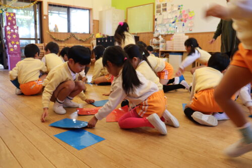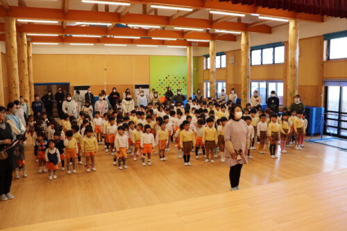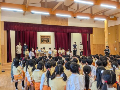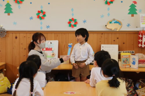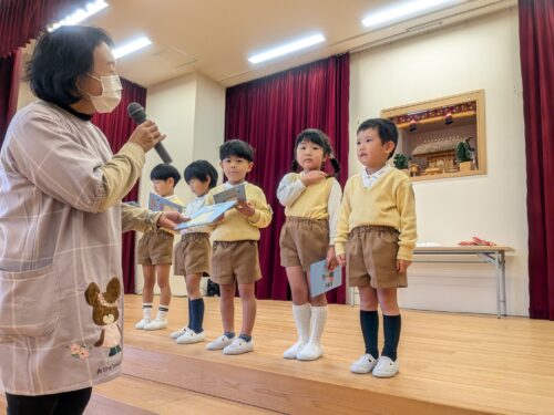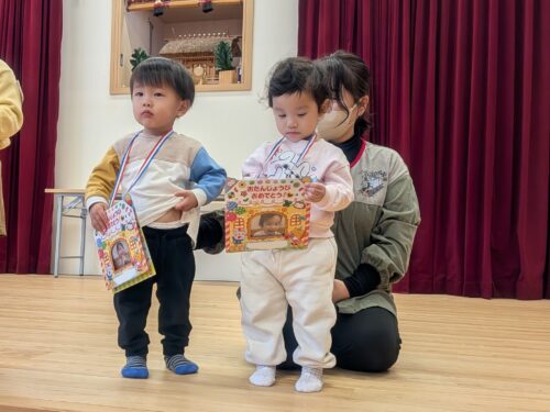 2025年12月9日 12月生まれ誕生祭♪ 今日は12月生まれのお誕生祭がありました。名前を呼ばれて舞台に上がります♪ひよこ組さんもおめでとう♡誕生日の歌を皆でプレゼントしました。お部屋ではインタビュー。好きな動物はキリンなんだって♪オセロゲームをしたよ!外遊びを楽しんだ後は、誕生祭ランチを頂きました☆