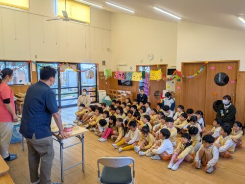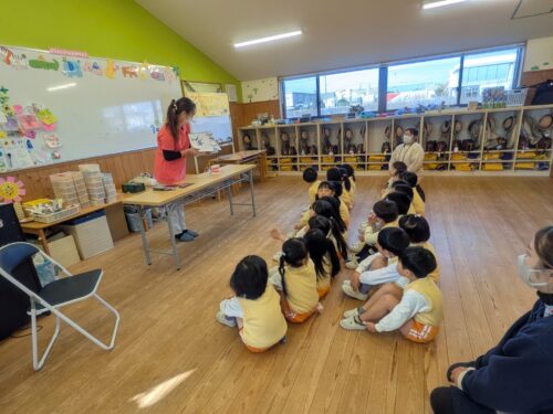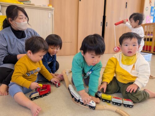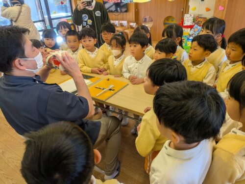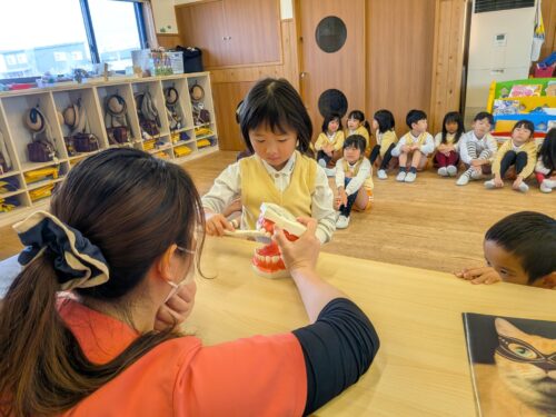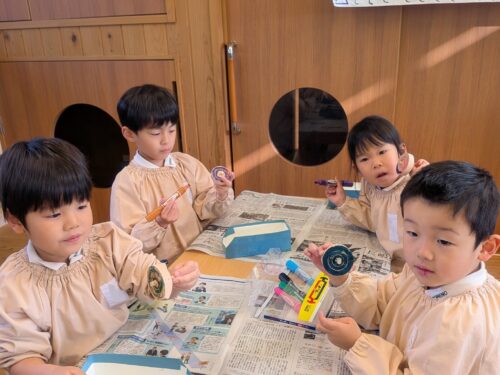 2025年12月11日 歯科講習♪ 今日は園医のとく歯科さんによる歯磨き講習(年長児)がありました。歯を磨かないとどうなるのか紙芝居を見た後は歯の模型を使って歯の磨き方を教えて頂きました。一人一人歯ブラシで歯磨きの練習をしたよ。自分のこまに色を塗っていきます。コマまわったよ~♪白い飾りを付けたら帽子の完成☆電車が発車しまーす!