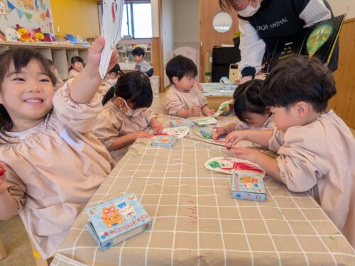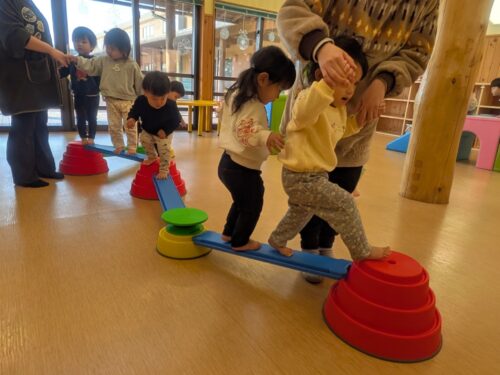 2026年1月13日 今日の子どもたち♪ 今日は体育あそび♪一分跳びに挑戦!ボールから逃げろ~!影に氷がはっていました☆冷たーい!お正月に遊ぶおもちゃが載っているよ。塗り絵をしたよ♪落ちないよう慎重に進んでいます♡