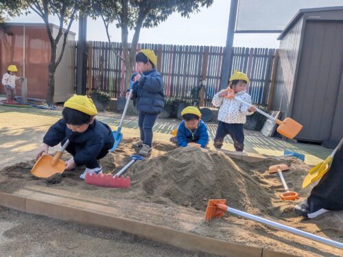 2026年1月16日 避難訓練♪ 今日は地震・火災の避難訓練がありました。自分の身を守ることの大切さを聞きました。終わった後は朝の会♪月刊誌を読んだり、絵を描いたりして過ごしました。大きいスコップを持ってお山作り!
