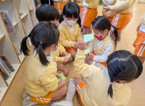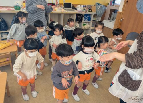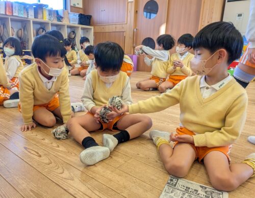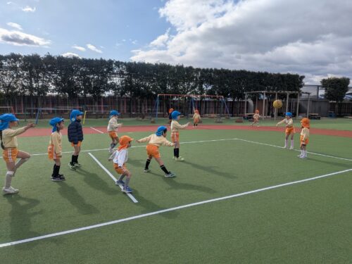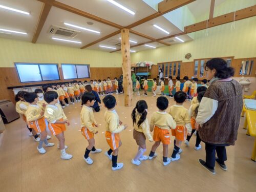 2026年1月30日 今日の子どもたち♪ 年長さんと年少さんが一緒にドッジボールを楽しんでいました♪新聞紙のお豆のできあがり♪発表会のくじ引きをしました。どこの席かな?おばけなんてないさ♪鬼さん塗ったよ!