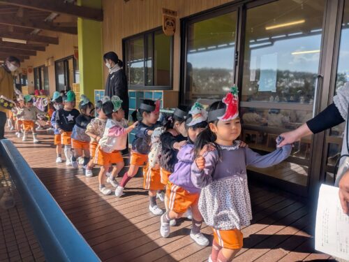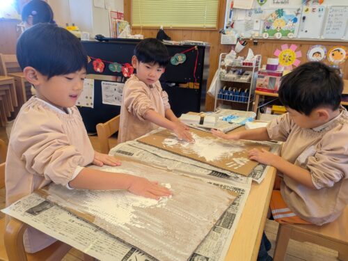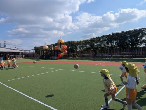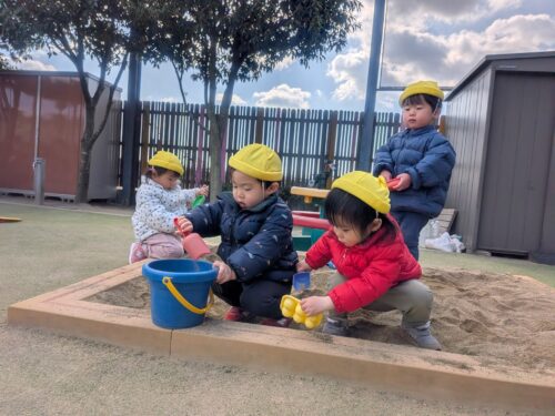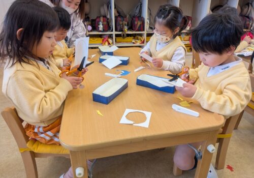2026年2月2日 今日の子どもたち♪ 今日は体育あそびがありました。片足跳びできるかな?お友だちまでボールを投げるよ!えいっ!手で色を広げていくよ☆はさみ上手に使えるようになったよ。おばけ列車通りまーす♪砂場で遊んだよ!