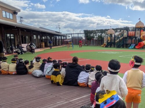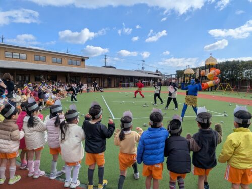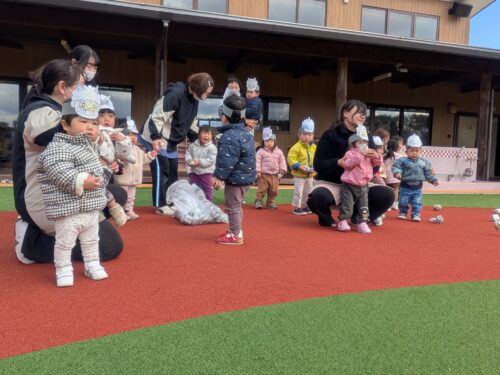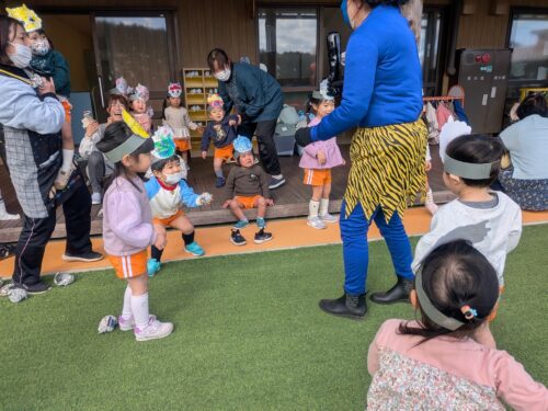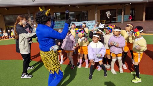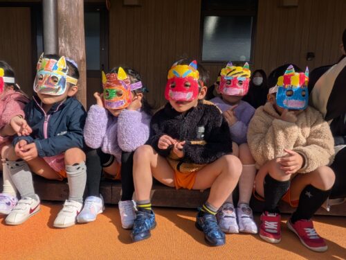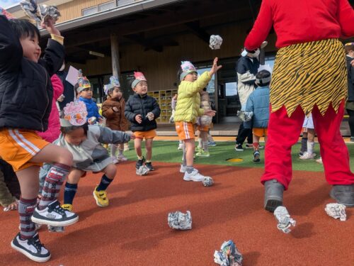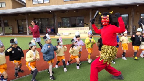 2026年2月3日 節分祭・豆まきあそび♪ 今日は全園児で豆まきあそびを行いました。節分の由来の話を聞き、豆まきや鬼のパンツを踊ったりしました。心の中の鬼はいなくなったかな? 節分祭の始まりです!子どもたちは自分で色を塗ったお面を装着☆お話を聞いていると太鼓の音が…鬼さん登場!新聞紙で作った豆を持って、豆まきです!鬼はー外!福はー内!心の鬼を退治した後はみんなで鬼のパンツを踊りました♪強いぞー!強いぞー!鬼さんバイバーイ!