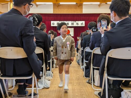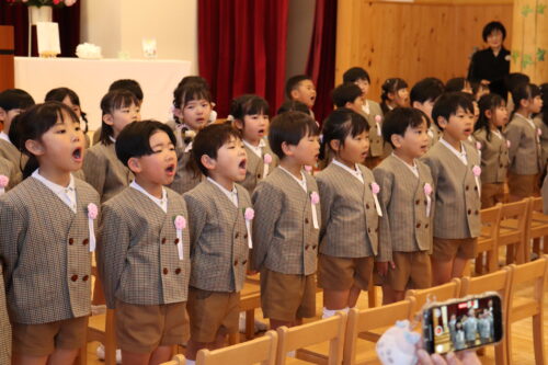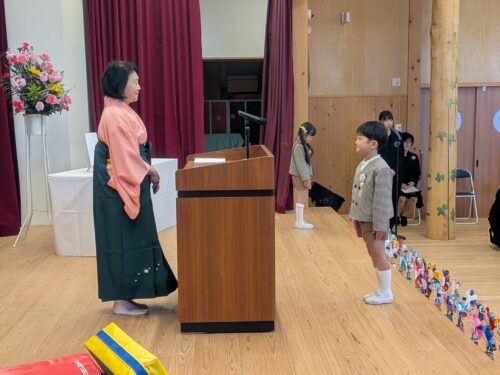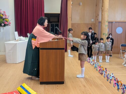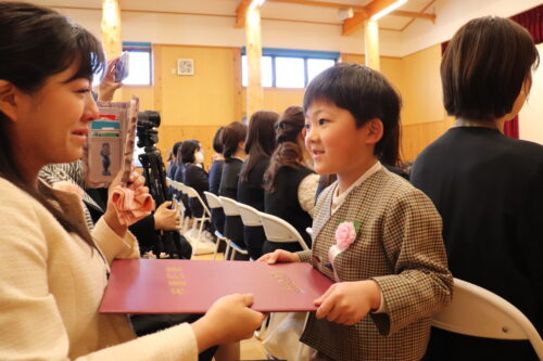 2026年3月24日 卒園証書授与式 今日はNOBENOこども園年長児48名が保護者様ご臨席の下、卒園式が執り行われました。 4月からは小学生。NOBENOこども園で培ったたくさんの自信を胸に、小学校へ行っても元気に頑張って下さいね。 卒園式が始まりました。落ち着いた雰囲気で席に着きます。卒園証書授与。壇上で園長先生と向き合い証書とお祝いの言葉を受け取ります。お家の人に向けてのメッセージ。みんなで「こころのねっこ」「たいせつなともだち」を歌いました。きれいな歌声と共に心を込めて感謝の言葉を伝えました。卒園時の退場です。卒園おめでとう!たくさんの先生に見守られながらこども園を後にしました。