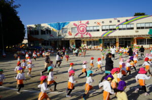 今日は、年長児と年中児が合同でリレーを楽しみました。また、ホールでは月曜日の「おもちつき」に向けて動画を視聴し、その後、各クラスで杵と臼の見学をしました。
