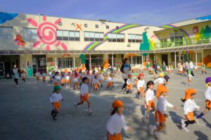 昨日から幼稚園では恒例のマラソン(ランニング)が始まりました。これからやってくる本格的な冬に備え、体操とランニングを継続的に行うことで寒さに負けない丈夫な身体を作ることを目的とします。今日も登園後にランニングを行い、走る前には「No.1体操」と準備運動で体をほぐし、その後、音楽に合わせて元気よく園庭を走りました。