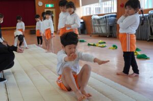 今日は、年長児・年中児の体育あそびがありました。マットで前転の練習をしたり、年長児はなわとびも練習したりしました。