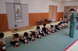 今日は、三学期最初の年長児の茶道がありました。二学期までに学んだ作法を復習しながら、お茶を点て、お茶菓子をいただきました。2週間後には園児が保護者様にお点前を披露する、茶道参観を控えており、真剣にお稽古に取り組んでいる様子でした。