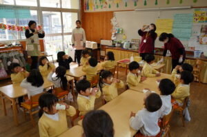 今日は年長児の英語あそび参観がありました。来園していただいた保護者さんには、専任講師に色々な教材を使って指導をしてもらっている様子や、講師と園児たちが楽しく英語でコミュニケーションを取って学んでいる様子を見てもらいました。