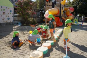 朝晩の冷え込みが厳しいですが、日中は暖かく過ごしやすい一日でした。戸外では砂場あそび、室内では、かるたや制作あそびを楽しんでいました。