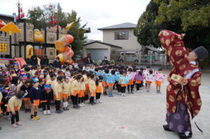 今日は節分祭・豆まきあそびがありました。まずは久居八幡宮へ行き、みんなでお参りをし、宮司(園長)から節分のお話をしてもらい、その後は園庭で宮司が豆まきを行いました。豆まきあそびでは、突如園庭に現れた赤鬼と青鬼に少し驚きながらも、知らず知らずうちに心の中に入り込んでしまったかもしれない鬼を追い出すために「鬼は外!」と新聞紙を丸めて作った豆を投げ、勇気を出して鬼を追い払いました。その後は豆により綺麗な心になった鬼たちと踊りを楽しみ、いい子になることを約束してお別れをして豆まきあそびを終えました。