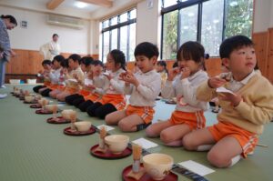 今日の年長児の茶道では、サザエの形をした最中を作りました。最中の皮に自分の好きな量のつぶ餡を入れ、特製最中が完成しました。茶道場が最中の良い香りに包まれる中、園児たちはパリパリと美味しそうな音を立てて、いただいていました。