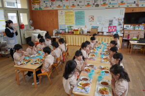 青空が広がる良いお天気でしたが、気温は低い一日でした。今日の給食は寒い日にぴったりのポークシチュー。温かくて美味しいシチューに、体もぽかぽかと温まり、園児たちは大喜びでした。