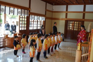 今日は2月生まれの誕生祭がありました。神社では、お祓いを受けた後、祢宜さんから久居八幡宮の神様に一つ成長した事を奉告していただいて、参拝をしました。神社での誕生祭の後には拝殿の前で記念写真を撮り、誕生児の保護者さんと一緒にクラスでのお誕生会と自由あそびを楽しみました。