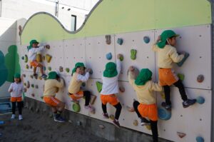 今日の幼稚園では、砂場にあるゲームクライミングを楽しむ姿が見られました。体をしっかり動かした後は、給食の時間。醤油ラーメンとごぼうサラダ、フルーツを美味しくいただきました。