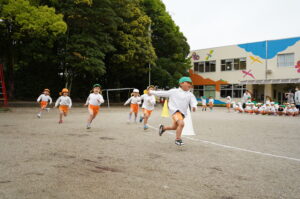 年中児は園庭でかけっこを楽しみ、年長児はクラス対抗のリレーに取り組みました。年少児は園生活にも少しずつ慣れてきた様子で、友だちと一緒に砂場で遊んだり、遊具を使った戸外あそびを楽しんでいました。