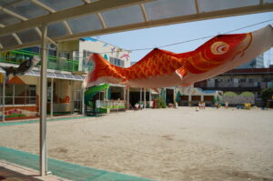 5月のこどもの日を前に、園内ではこいのぼりが風に乗って元気に泳ぎ始めました。登園してきた園児たちは、カラフルで迫力のあるこいのぼりを見つけると、興味津々の様子でした。教室からは「こいのぼりのうた」を元気に歌う声も聞こえてきて、園児たちは幼稚園生活の中で日本の伝統行事に親しんでいます。