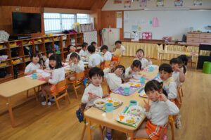 今年度最初の4月生まれの誕生祭がありました。久居八幡宮で参拝を行い、神様にまたひとつ大きくなった姿を見ていただきました。その後は、参観に来ていただいた保護者の方と一緒に誕生会や園庭での戸外あそびを楽しみました。給食の時間には、お祝いの赤飯や唐揚げ、デザートのケーキを嬉しそうに味わっていました。