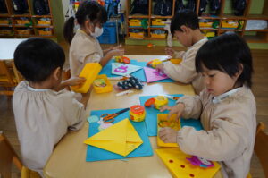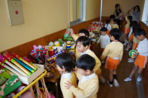 今日は、2歳児満3歳児にじ組と年中児さんが、金曜日に行われるお店屋さんごっこの下見に行きました。美味しそうな食べ物やおもちゃ、アクセサリー等、品揃えが豊富で、園児たちは品物を手に取って目を輝かせていました。年長児は、自分たちのアイデアが詰まった品物の説明をしたり、使い方を教えてあげたりして、当日のお店屋さんごっこに期待を高めていました。