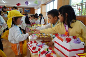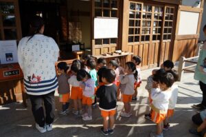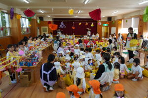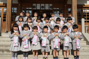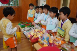 今日は、子どもたちが楽しみにしていたお店屋さんごっこがありました。ホールには、年長さんが工夫を凝らして制作した素敵な品物が沢山並び、「いらっしゃいませ!」「○○ありますよ!」「これいかがですか?」という年長児さんの元気な呼び込みと、にじ組、年少・年中児のお客さんの声で終始、賑わっていました。また、久居八幡宮へ七五三詣りに行き、いつもお守りいただいていることへの感謝を込めて参拝をしました。その後は拝殿の前で整列をし、自分たちで作った千歳飴の袋を持って記念写真を撮りました。