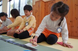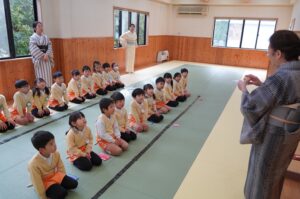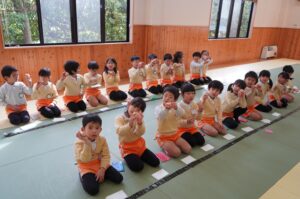 今日の年長児の茶道では、サザエの形をした最中を作りました。最中の皮に自分の好きな量のつぶ餡を入れ、特製最中が完成しました。茶道場が最中の良い香りに包まれる中、園児たちはパリパリと美味しそうな音を立てて、いただいていました。