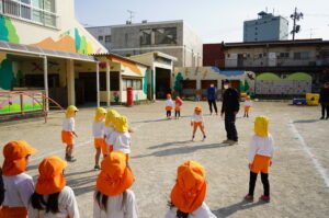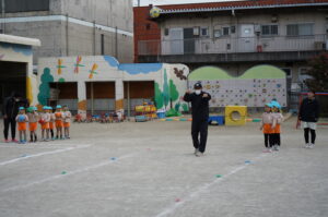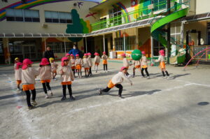 今日は、年中児と年長児の体育あそびでドッジボールをしました。まずは、ボールの投げ方の指導で、遠くに投げるには、手のひらにしっかりボールを乗せて、足・腰を使って投げることが大切ということやボールの受け方を教えてもらい、その後にみんなでドッジボールを楽しみました。 投げ方を指導してもらい 遠くに投げる練習をして みんなで ドッジボールを楽しみました 年少児の体育あそび 一覧へもどる 誕生祭