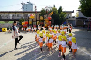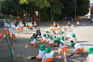 昨日から幼稚園では恒例のマラソン(ランニング)が始まりました。これからやってくる本格的な冬に備え、体操とランニングを継続的に行うことで寒さに負けない丈夫な身体を作ることを目的とします。今日も登園後にランニングを行い、走る前には「No.1体操」と準備運動で体をほぐし、その後、音楽に合わせて元気よく園庭を走りました。