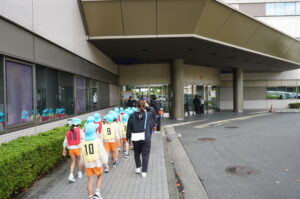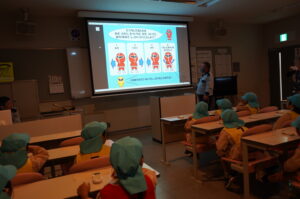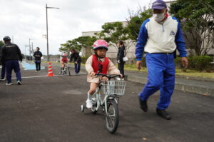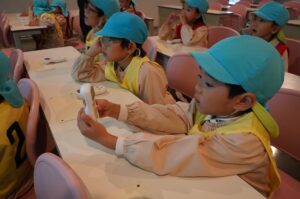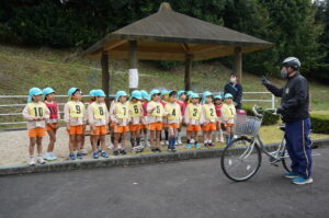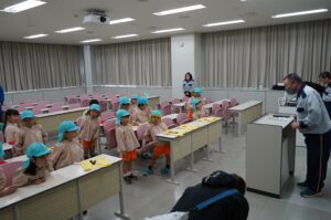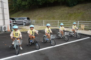 今日は、年長児うめ組が交通安全研修に行きました。屋外ではダミー人形の飛び出し事故実演を見て、横断歩道の渡り方や自転車正しい乗り方を教えてもらいました。その後は、屋内で交通安全こども大使カードを作成し、マルチメディア紙芝居を見て交通安全に関するクイズを解きました。