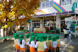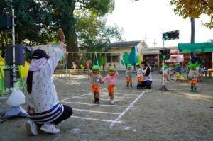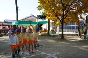 今日は交通安全訓練を行いました。西園庭に信号機を設置し、これまでに教わってきた正しい横断歩道の渡り方に則って、「右よし! 左よし! 右よし! 信号よし!」と安全確認をしてから、周りによく見えるように手を挙げて横断歩道を渡りました。