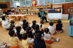 今日は、年少児れんげ組がシェラリン先生の英語あそび、年中児は体育あそび、年長児はロス先生との英語あそびなどを楽しみました。シェラリン先生との英語あそびでは、形を手で表現しながら英語で答えたり、体育あそびではマットの傾斜を使って後転に挑戦したりしました。また、ロス先生との英語あそびでは、「できる」「できない」を “Yes, I can.” “No, I can’t.” と英語で答え、楽しみながら学ぶ姿が見られました。