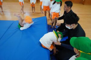 体育あそびでは、マットの傾斜を使って後転に挑戦