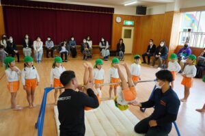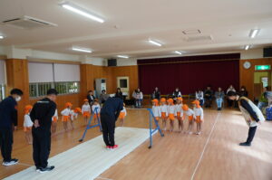 今日は年中児の体育あそび参観がありました。後方の観覧席で保護者が見守る中、園児たちは、いつもより張り切ったり、緊張したりする子もいましたが、体育講師の話をしっかり聞き、真剣に取り組む姿を見てもらうことができました。