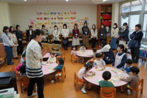 本日は、2歳児・満3歳児クラス「にじ組」の保育参観がありました。入園してから早くも8ヵ月が経ち、参観では教室で歌やリズムを楽しむ姿や、活動に取り組む姿を見て、成長を感じていただきました。 2歳児・満3歳児クラスにじ組の保育参観 成長した姿を感じていただきました 消防署見学 一覧へもどる