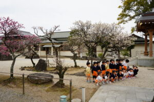 今日は、年長児が硬筆で書いた名前と、年中・年少・にじ組の園児が描いた絵を野辺野天満宮へ奉納しました。明日の生活発表会の会場練習がうまくいくよう願いを込めて参拝し、参拝後は、境内に咲いている紅白の梅の花を見たり、記念写真を撮ったりして、春の訪れも感じるひとときとなりました。