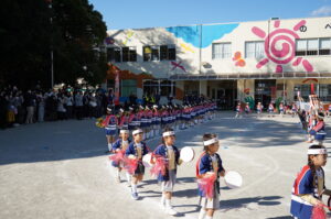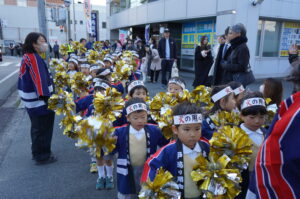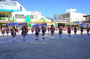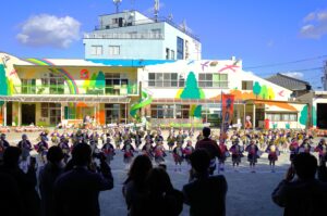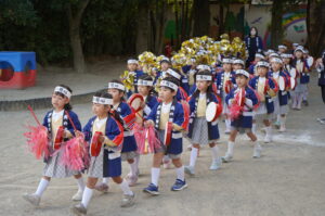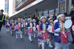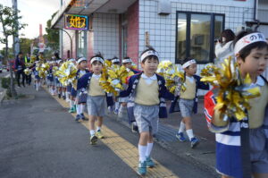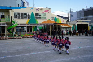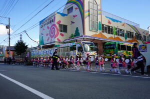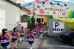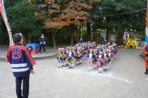 本日は、年長児による市中防火パレードがありました。 園児たちは「のべの幼年消防隊」として、津市消防本部のご協力のもと、園周辺地域の皆様に防火と防犯を呼びかけました。道路では消防車が伴走し、津南警察署の皆様にも交通整理でご協力をいただきました。多くの保護者や近隣住民の方々が見守る中、園長を先頭に、園児たちはハチマキ・法被姿で元気よく行進しました。
