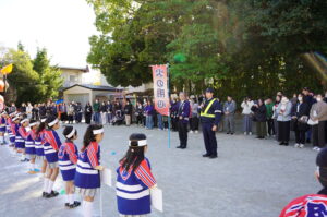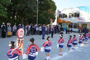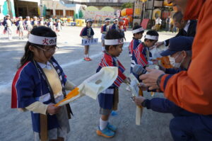 幼稚園に戻ってからは、堂々とした防火演技を披露し、最後に拍子木の合図に合わせて「火の用心」を力強く呼びかけました。また、今日パレードを頑張った園児たちには、津市消防本部と津市防火協会より記念品をいただきました。