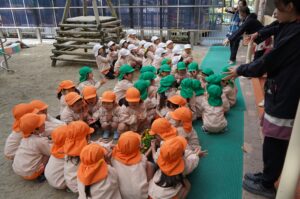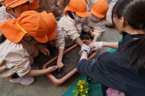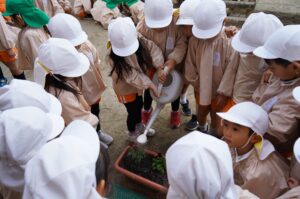 今日は、年中児がチューリップの球根とビオラの苗をプランターに植えました。根付くように土をよくほぐしてふかふかにし、掘った穴に球根や苗をそっと入れて土をかぶせました。最後に、水をたっぷりあげて「大きくな~れ!」と願いを込めていました。