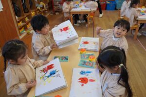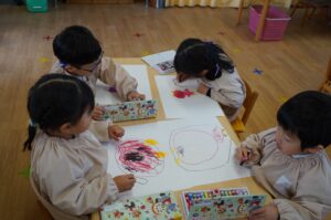 今日は、各クラスで節分の思い出の絵を作りました。ご家庭での節分や、昨日の豆まきあそびの様子を思い出しながら、クレヨンで描いたり、折り紙を貼ったりして、思い思いの作品を仕上げていました。