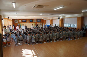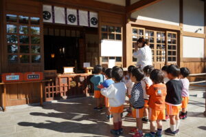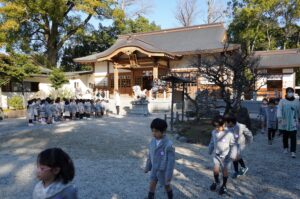 今日は、全園児がホールに集まり二学期の終業式がありました。園長先生から、二学期の行事を振り返るお話や、冬休みを健康・安全に過ごす為のお話などがありました。終業式のあとには久居八幡宮へ行き、無事に二学期を終えられたことの奉告と冬休みの安全を祈り、参拝をしました。