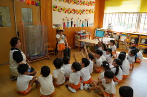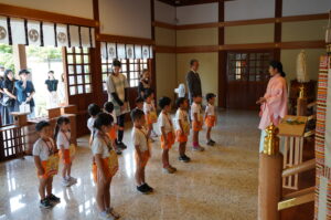 今日は8月生まれの誕生祭がありました。久居八幡宮では、祢宜さんにまた一つ大きくなったことを神様に奉告してもらいました。その後、教室でお誕生会を行い、残暑の厳しい中ではありましたが、園庭では参観の保護者と一緒に元気いっぱい活動し、楽しいひとときを過ごしました。 8月生まれの誕生祭。久居八幡宮で祢宜さんのお話を聞き 幼稚園では、誕生月の園児に質問をしたり 保護者さんと一緒に、教室での活動や 戸外での活動を楽しみました 夏休みの思い出 一覧へもどる 茶道