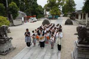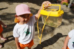 西園庭には、風で落ちた木の実や葉っぱがたくさん散らばり、カマキリやバッタが元気に飛び回っていました。園児たちはそれらを拾ったり捕まえたりしながら、お友だちと見せ合って楽しんでいました。