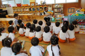 今日の室内活動では、ちゅうりっぷ組がシェラリン先生と一緒に英語あそびを楽しみ、ばら組では細かくちぎった紫色の折り紙を貼って、さつまいも作りをしていました。